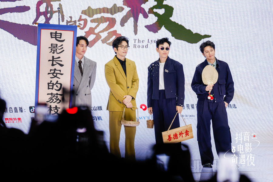 粤产暑期大片《长安的荔枝》剧组再度亮相,导演兼领衔主演大鹏,领衔主演白客、刘俊谦,友情出演孙阳组成的“荔枝F4”登台推介。影片改编自马伯庸爆款同名小说,讲述了唐代小吏李善德挑战不可能,千里送荔枝的故事。